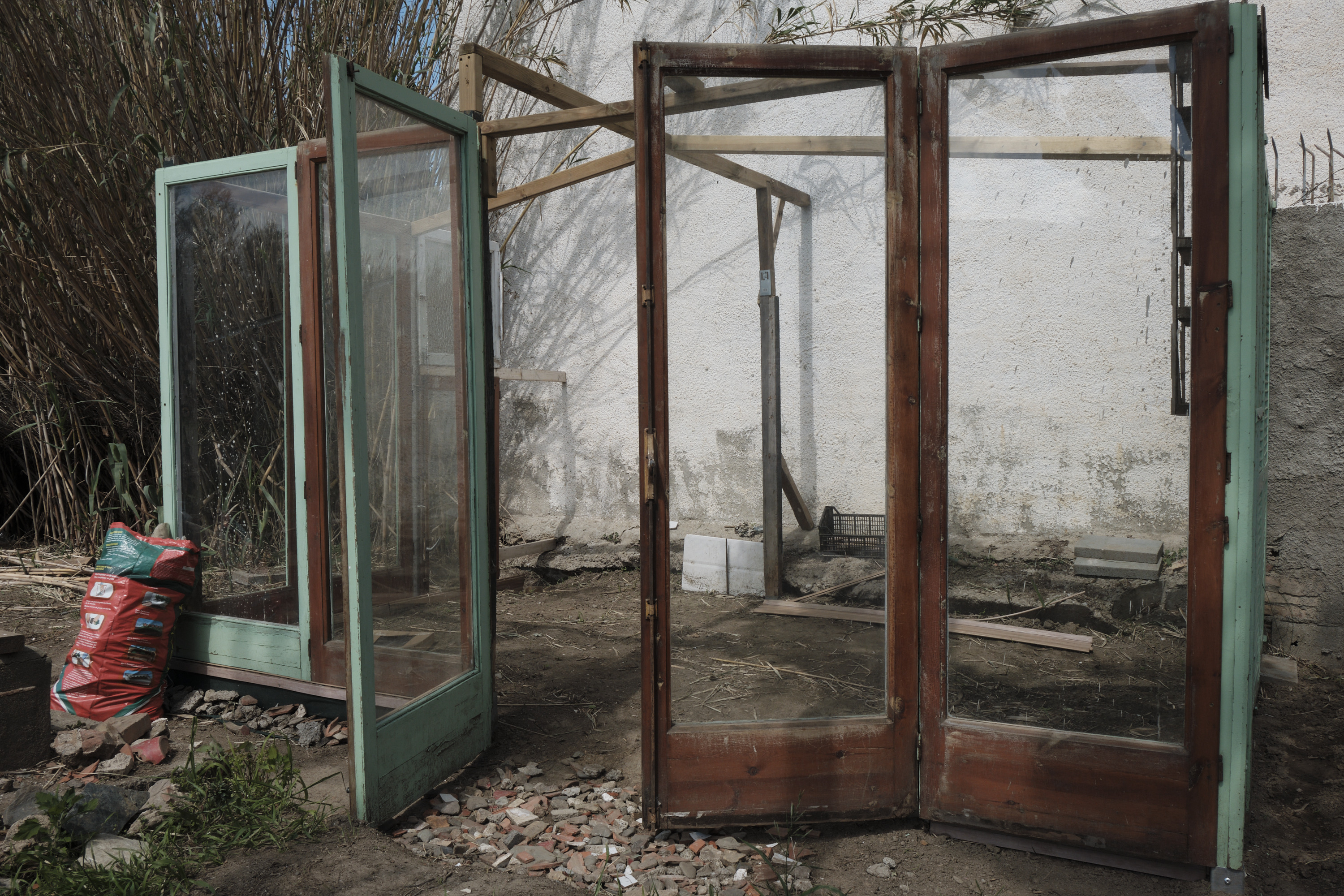 Fidels a la filosofia de les 3 «R» ( Reduir, Reciclar, Reutilitzar), amb les canyes de ribera que van haver de tallar per recuperar el terreny i fusta han construït unes tanques precioses i un galliner on l’ Olivia, la gallina més veterana, conviu amb cinc joves més; han recuperat tancaments de vidre retirats de apartaments turístics després de reformes i amb ells han construït un magnífic hivernacle on pensen cultivar mongetes; d’uns rentamans que van trobar enmig de la brossa, han fet jardineres per les maduixes…si Marcel Duchamp aixequés el cap!