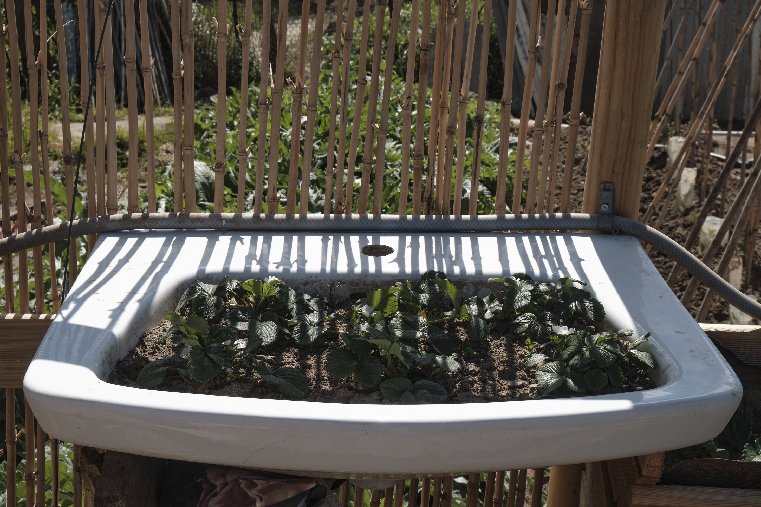 Fieles a la filosofía de las 3 «R» ( Reducir, Reciclar, Reutilizar), con las cañas de rivera que tuvieron que cortar para recuperar el terreno y madera han construido unas vallas preciosas y un gallinero donde Olivia, la gallina más veterana, convive con cinco jóvenes más; han recuperado cerramientos de cristal que se habían retirado de apartamentos turísticos después de reformas y han construido un magnífico invernadero, donde piensan cultivar judías; de unos lavamanos que encontraron en medio de la basura, han hecho jardineras para las fresas…si Marcel Duchamp levantara la cabeza!